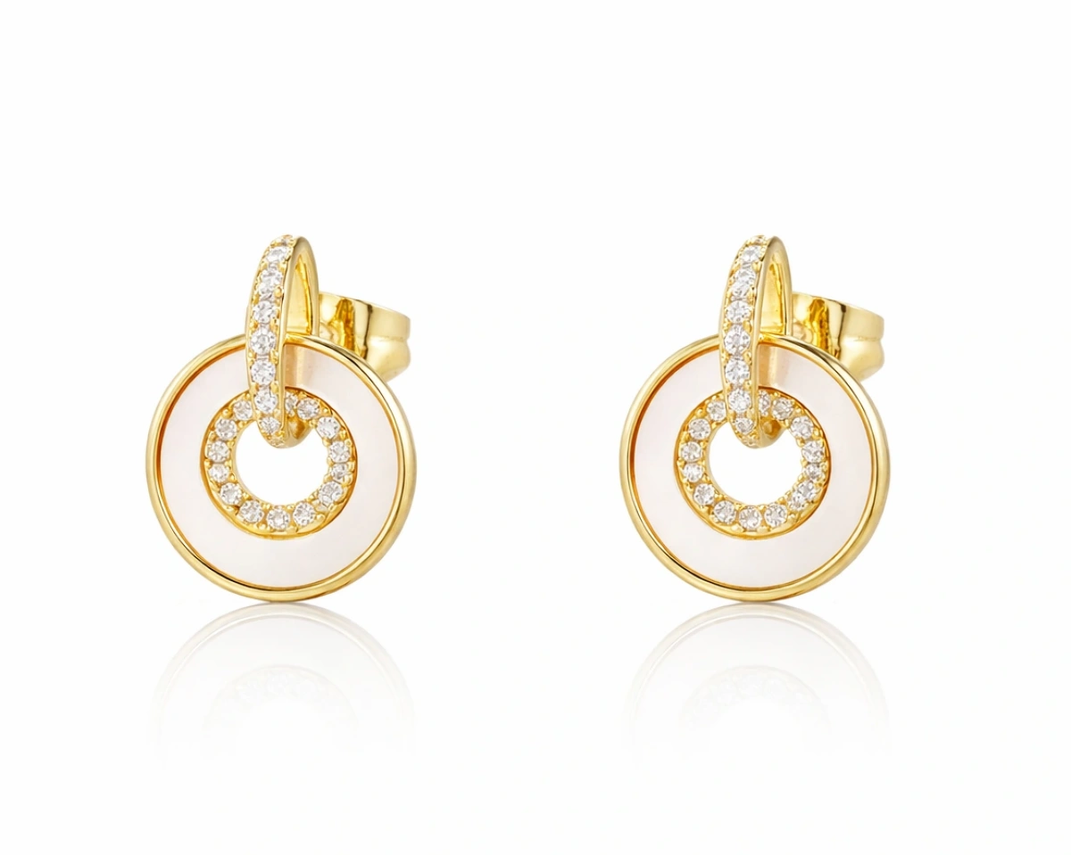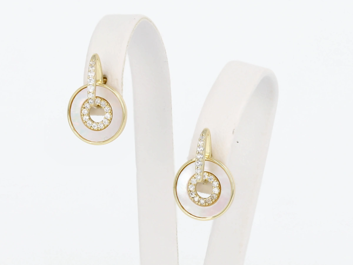 Kolczyki z dodatkiem masy perłowej wykonane z miedzi, pozłacane 14k złotem. Pokryte dodatkowo lakierem jubilerskim, który przedłuża żywotność koloru i nadaje wspaniały blask. Produkt antyalergiczny, nie zawierający niklu. Wysoka jakość materiałów i precyzja wykonania to cechy rozpoznawcze producenta.